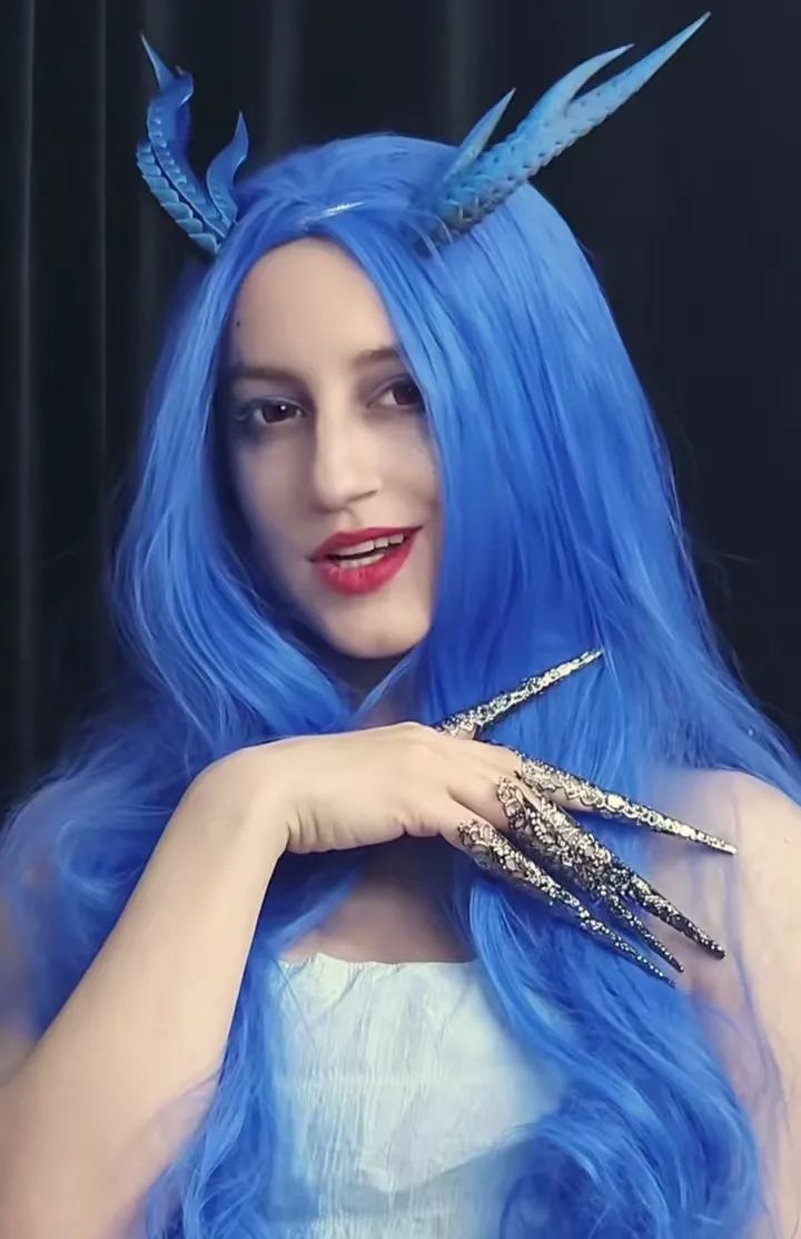 在另一个cosplay敖闰(东海龙王敖光的妹妹、敖丙的姑姑)的视频中,于中美的蓝色眼影晕染如孔雀翎羽般绚烂,手指不经意间缠绕着克莱因蓝色的发尾,眼神透出难以捉摸的神秘气息。她缓缓吐出一句:“有兴趣做个交易吗,大哥?”将敖闰的妖冶气质充分拿捏。