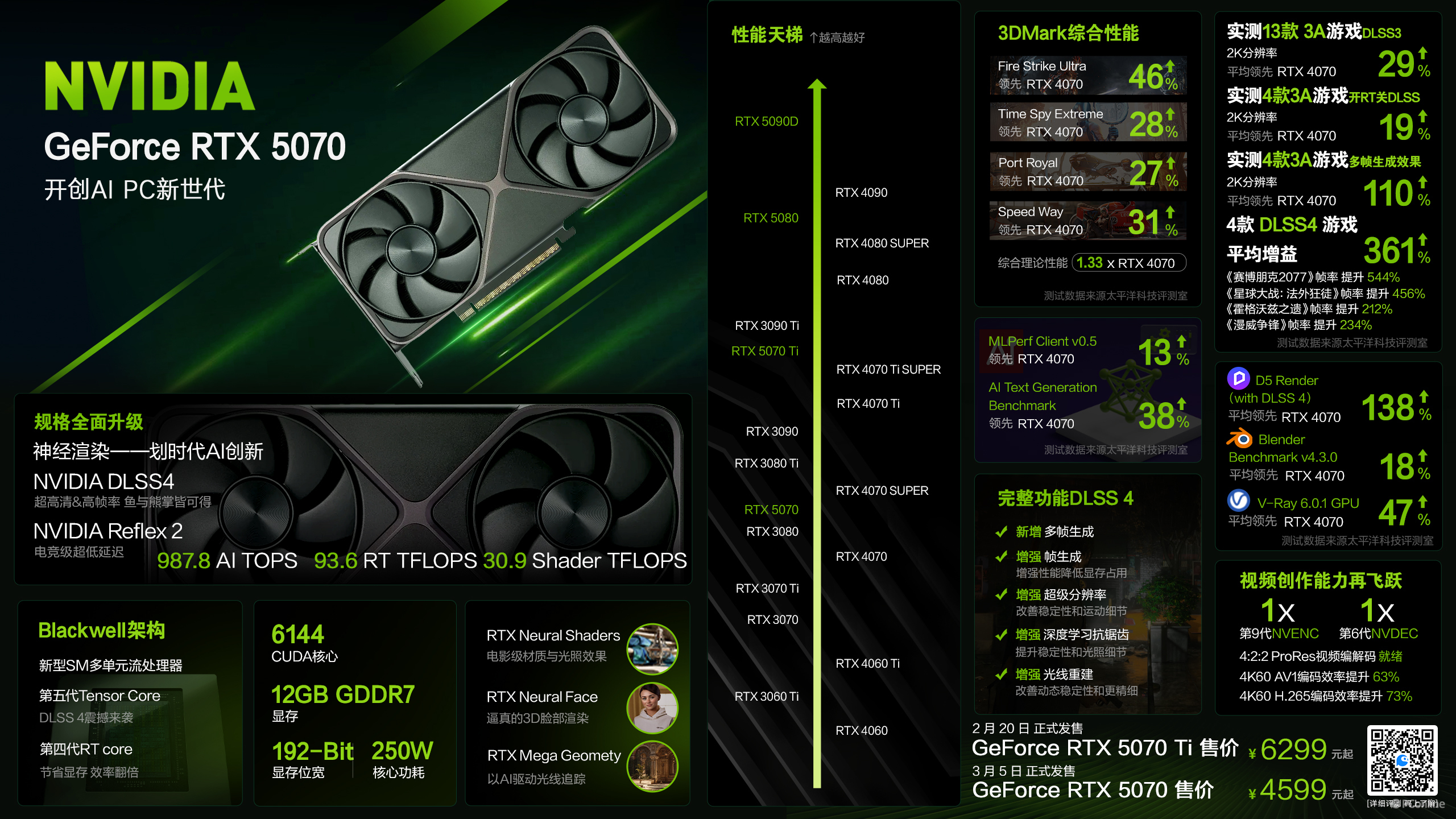 就在前两天,RTX 50系的70级显卡终于来了!全新服务器级别的Blackwell架构,TSMC 4N工艺打造,还有DLSS 4、Reflex 2等诸多黑科技集于一身!现在参数和定价上更为主流的GeForce RTX 5070来了。