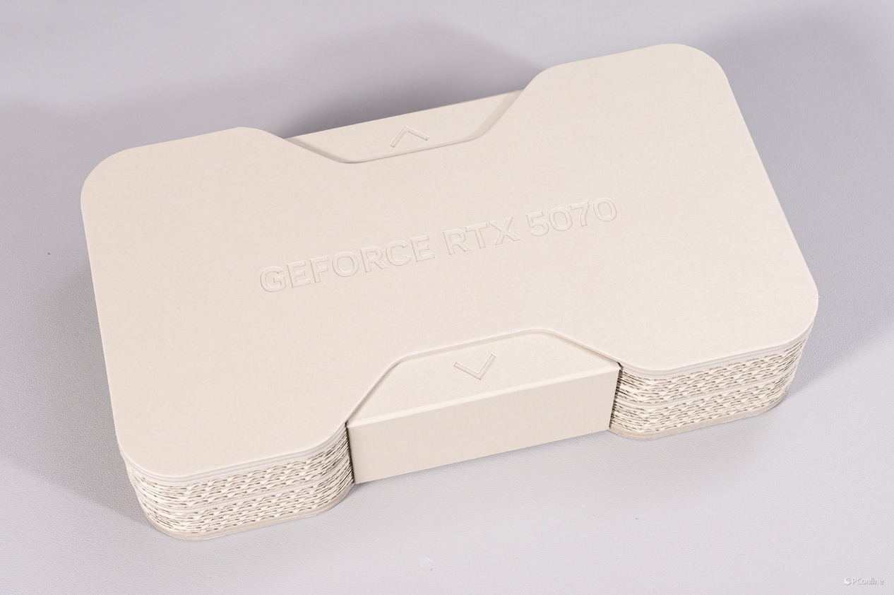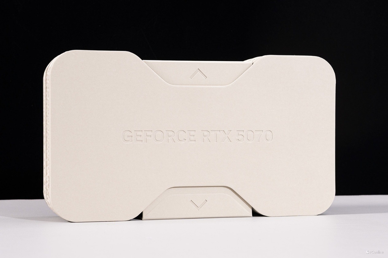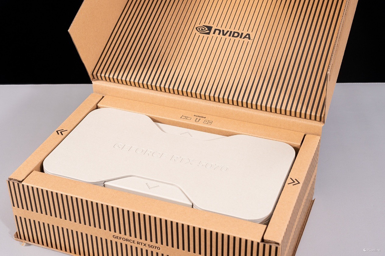 继续拆开包装就能看到显卡被放在一个充满设计感的包装盒中。包装盒表面再度注明了“GEFORCE RTX 5070“字样。