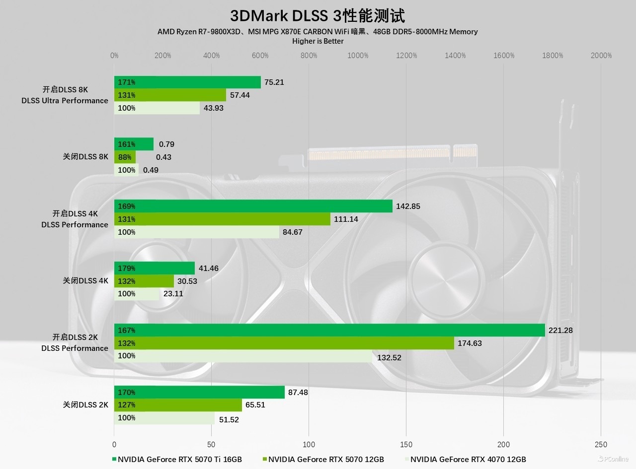 简单介绍完,我们再看看DLSS 4的理论表现如何,还是经典的3DMark测试。不得不说GeForce RTX 5070搭配上DLSS 4后,帧数就跟打了鸡血一样,开关前后的性能简直天壤之别!其中2K分辨率下,开关前后性能差距接近5倍之多。4K分辨率下就更离谱了,开关帧数差距得有6倍,即便是对比DLSS 3的话,帧数也能提升70%以上,这已经快做到翻倍了,看来游戏要变天了。最离谱的还要属8K,要知道RTX 40时代,8K游戏在大多数玩家看来还不太实际,8K更像是高端旗舰的专属,但是现在GeForce RTX 5070在DLSS 4加持下可以做到105 FPS,只能说未来可期,说不定不久的将来,主流显卡也能有8K体验。