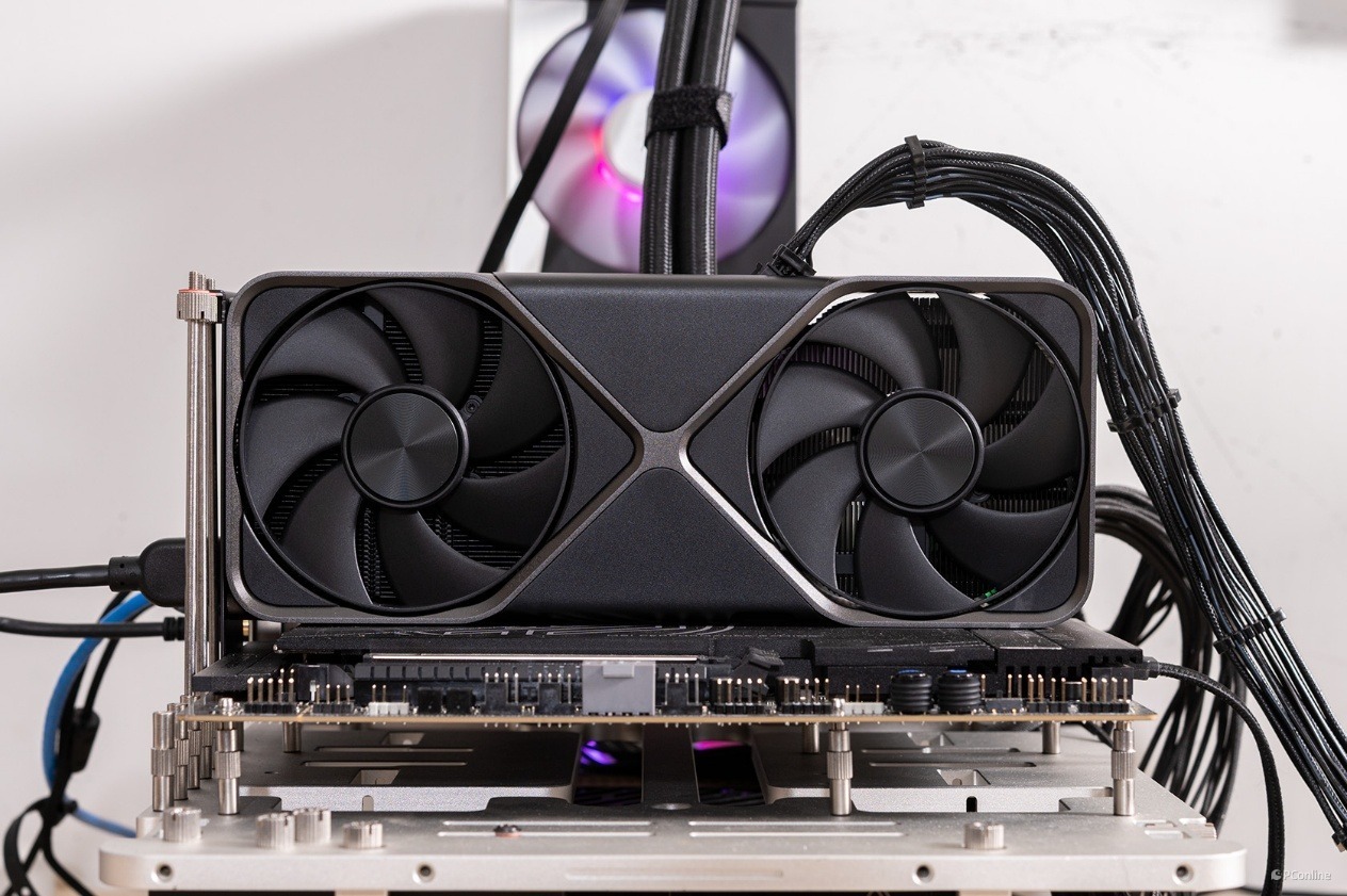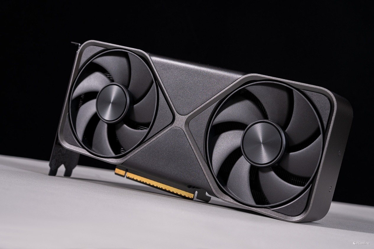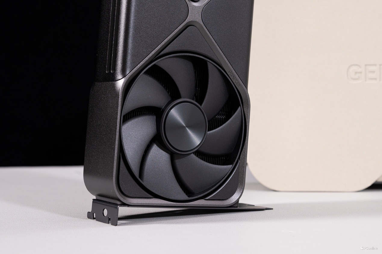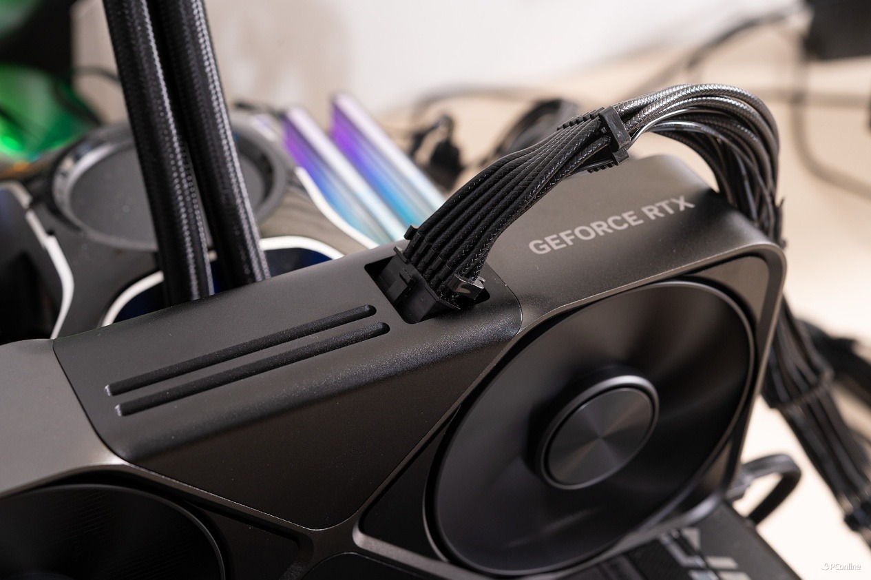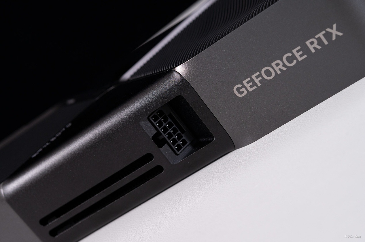 并且改回了如RTX 30系显卡时的斜插形式,这样不容易导致线材弯曲,从而也能降低烧显卡的风险。电源接口旁边则是标志性的“GEFORCE RTX“字样,进一步提升辨识度。