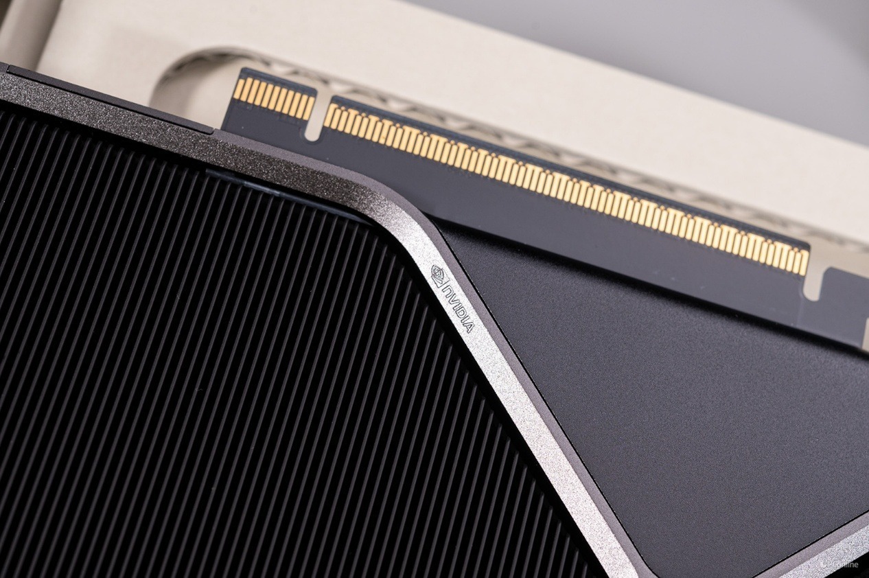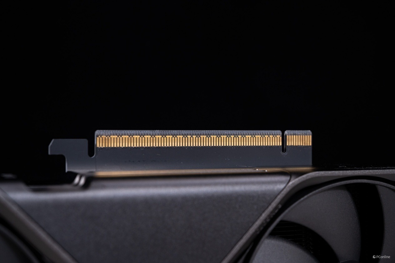 看完顶部再看看显卡底下的PCIe金手指,这一代的PCIe接口升级成为了5.0速率,这也是首次在RTX 50系显卡上应用,能够带来更高的传输速率,并且金手指的形状和上一代的显卡有些微的变化。