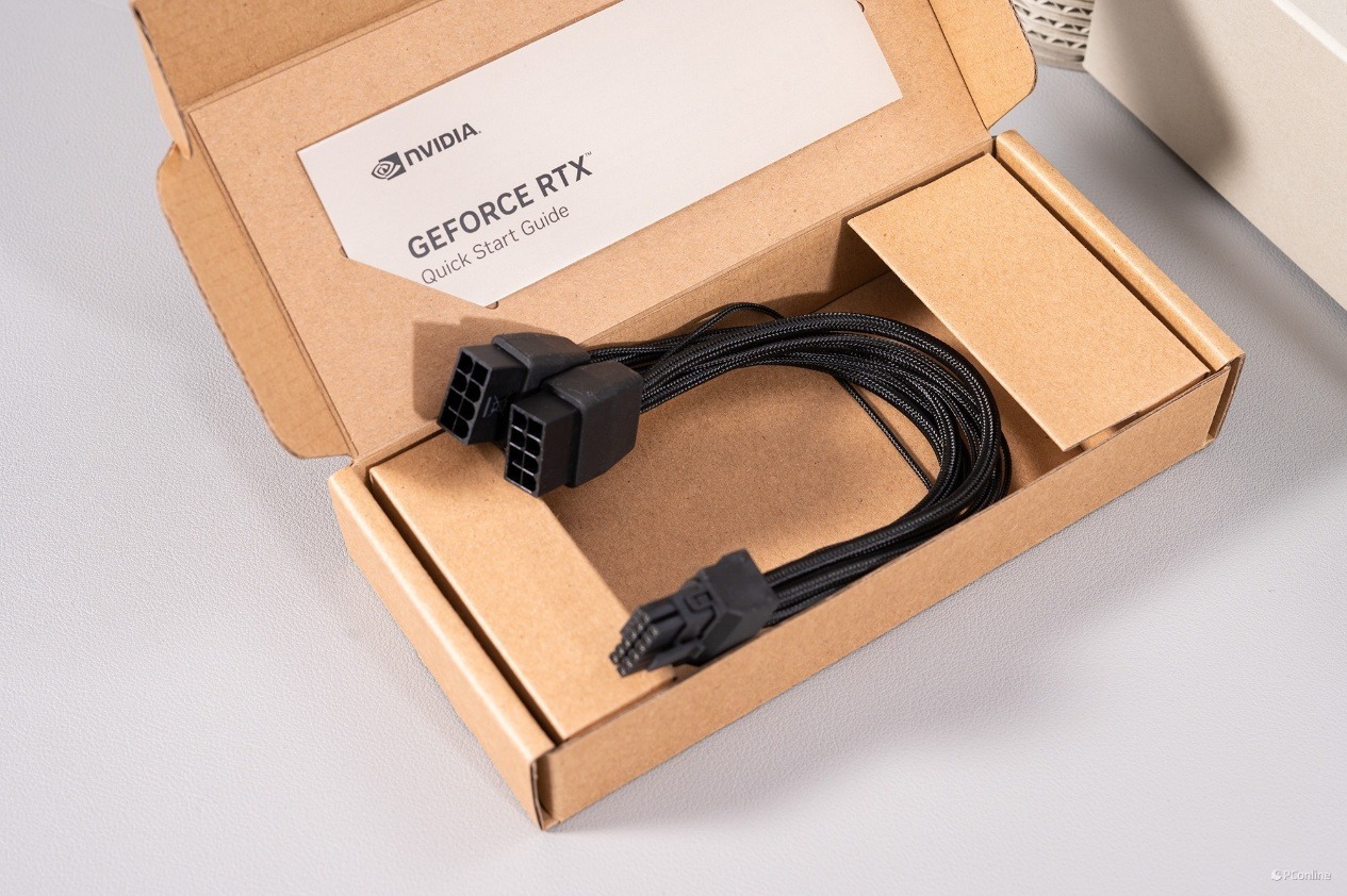取出上层的显卡包装,底下是说明书以及2×8Pin转16Pin的电源转接线,还没升级ATX3.0电源的玩家也能第一时间用上GeForce RTX 50系显卡。