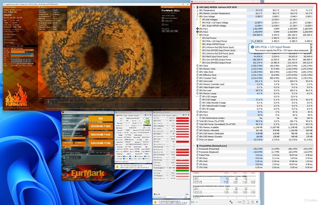 最后一项测试烤机,这也是许多玩家关注的重点,实测Furmark烧机10分钟后,得益于GeForce RTX 5070 FE出色的设计语言,以及卓越的制造工艺。烤机10分钟下GPU核心仅有73.4度,显存温度也是66度,此时显卡的最大功率为250.3W,已经完全顶着TDP的上限了。