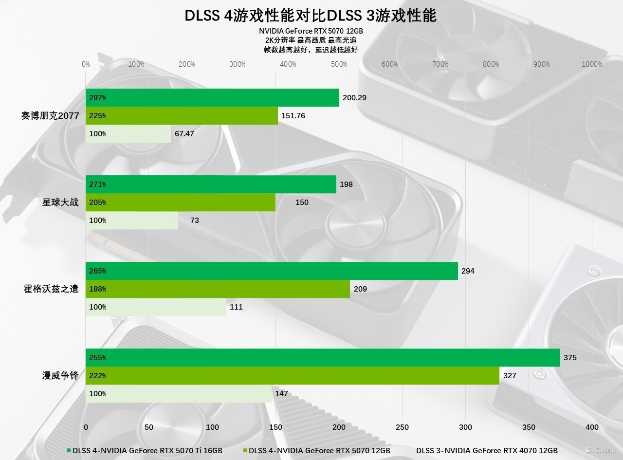 总的来说,DLSS 4多帧生成让最新的主流级显卡也能有过往旗舰级显卡的游戏性能,毫无疑问让玩家的游戏体验又上了一个台阶。就好像我们现在上手的GeForce RTX 5070,对比上代RTX 40系的DLSS 3帧生成功能,几乎是帧数的飞跃。同样的画质设置,RTX 5070的表现遥遥领先于RTX 4070,实测在上面提到的四款游戏中,开启DLSS 4的GeForce RTX 5070,帧数几乎是RTX 4070的翻倍!看来老黄吹嘘的RTX 5070有RTX 4090的性能确实不假!