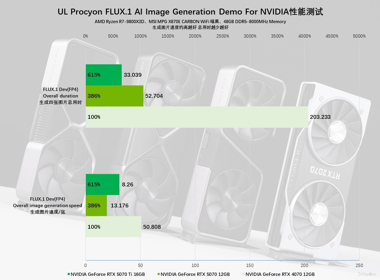 我们用UL Procyon的FLUX.1 AI Image Generation Demo For NVIDIA进行测试。在使用FP4精度模型时,GeForce RTX 5070能够做到13.176s生成一张图,而RTX 4070则要50秒以上,性能差距有3倍之多,同样的设置,生成4张图片,RTX 5070只需要52秒,而前代显卡则要足足3分钟以上。
