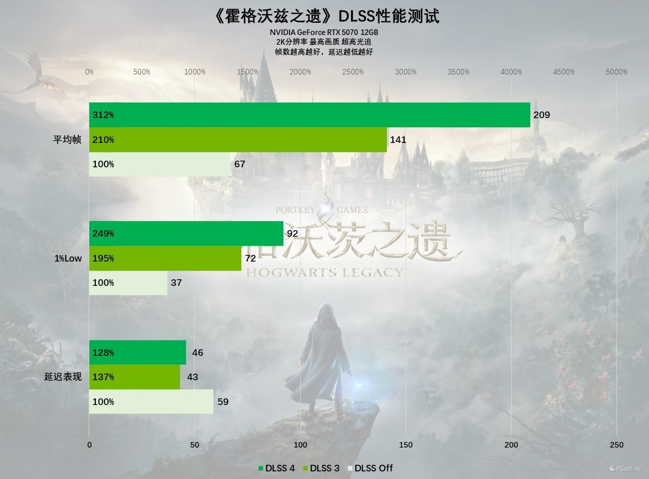 体验下来,《霍格沃兹之遗》这款游戏优化还是不错的,2K分辨率画质光追均设置最高的情况下,GeForce RTX 5070在不开任何超分的情况下,平均帧为67 FPS,流畅玩绝对没问题。如果开启DLSS 3质量档,此时帧数已经能够做到141 FPS了,体验已经相当丝滑了,基本达到了2K@144Hz的标准。开启DLSS 4以后,帧数就更夸张了,209 FPS已经不能算高刷了,应该叫丝滑。对比原生2K时,性能提升了约3倍以上。同时实际游戏过程中,无论是1%Low还是延迟都不错,特别是延迟,相比原生分辨率还要低不少,跟手感更好。