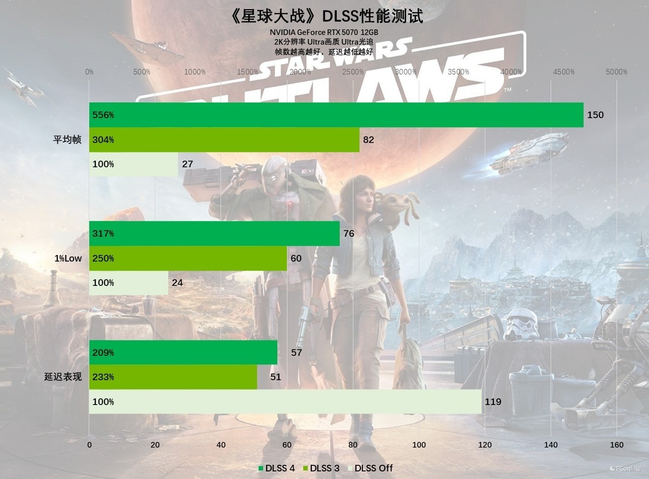 实测这款游戏对显卡的压力还是不小的,不开任何超分技术,几乎不可玩。在2K原生分辨率下,GeForce RTX 5070的平均帧仅有可怜的27 FPS,不单止卡成PPT,延迟也是高得吓人。此时开启DLSS 4质量档以后,游戏平均帧直接暴增至150 FPS,妥妥的2K高刷3A体验,对比原生2K的表现,足足有5.5倍左右的提升。即便是对比DLSS 3的82 FPS,那也是接近翻倍的性能提升,还是挺不错的。同时延迟表现也几乎下降了一半,非常可观。