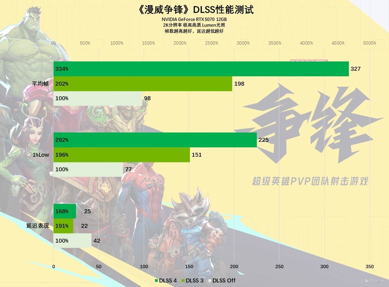 最后一款游戏是我们的老熟人《漫威争锋》,这款游戏在我们测试RTX 5090 D、RTX 5080以及RTX 5070 Ti之时,它还没有完全适配DLSS 4,玩家想要体验多帧生成功能还需要依靠NVIDIA app的DLSS 4优设功能。不过现在《漫威争锋》也正式支持DLSS 4了,与上面的游戏一样,玩家在游戏设置中就能直接开启,并且提供了2x、3x以及4x选项,玩家可以随意选择是插一帧、插两帧还是插三帧。