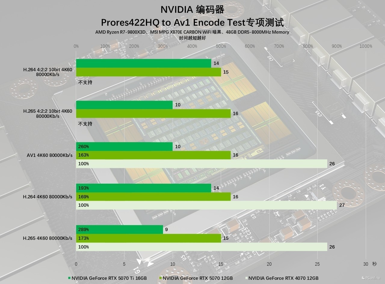 值得一提的是,GeForce RTX 50系显卡还能够支持4:2:2色度取样的视频编解码,这将节省CPU的负担,加快创作速度。上面的图表里也可以看到我们的测试成绩,实测导出时间会比上代显卡快不少,毕竟RTX 40系显卡不支持该功能,仅支持4:2:0色度采样,如果一定要4:2:2导出只能靠CPU软解。