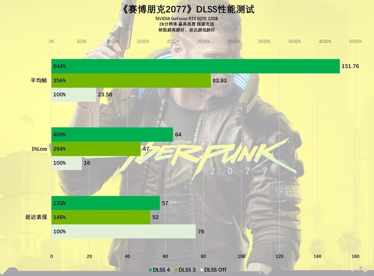 下面我们来看DLSS 4的性能表现,毕竟是“显卡杀手”,对显卡的压力确实不一般,在最高画质+路径追踪的情况下,GeForce RTX 5070只能跑23.58 FPS,几乎不可玩。开启DLSS 3以后,游戏帧数可以来到83.93 FPS,体感已经非常流畅了。而开启DLSS 4以后,GeForce RTX 5070能够做到2K分辨率151.76 FPS,已经是高刷级别的体验了。对比原生分辨率,性能足足提升了6.4倍。1%Low也非常出色,64 FPS的表现已经能够保障你的游戏足够流畅了,掉帧的情况少之又少,稳定性拉满。