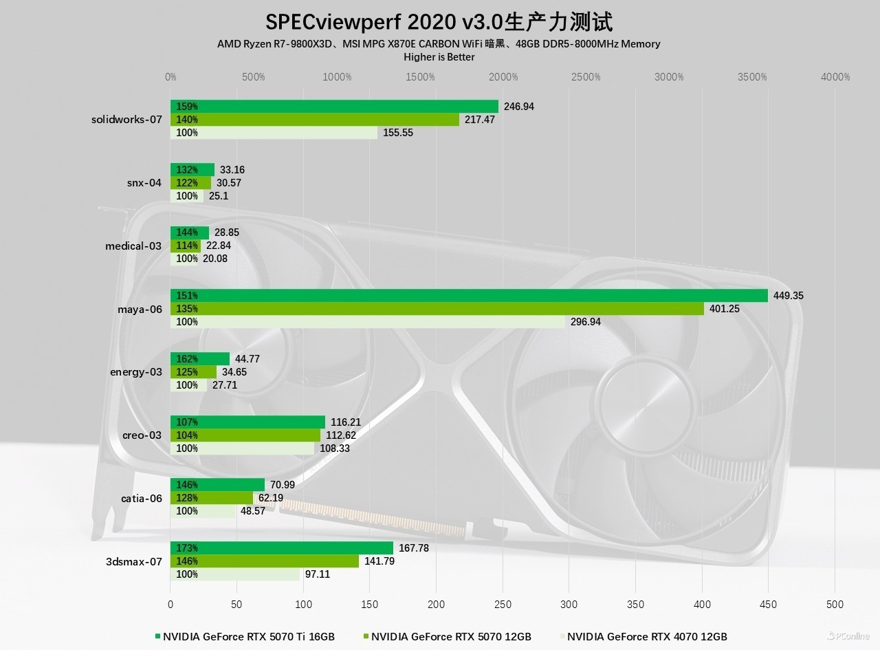 再看看工业领域的表现,SPEC2020能够反应显卡的工业能力,在多项测试中GeForce RTX 5070依旧傲视群雄,对比RTX 4070平均有30%的提升,这个性能提升还是很可观的,甚至有些超乎想象。并且不少项目中,它跟RTX 5070 Ti的差距也没有很大,基本都是10%左右的幅度。