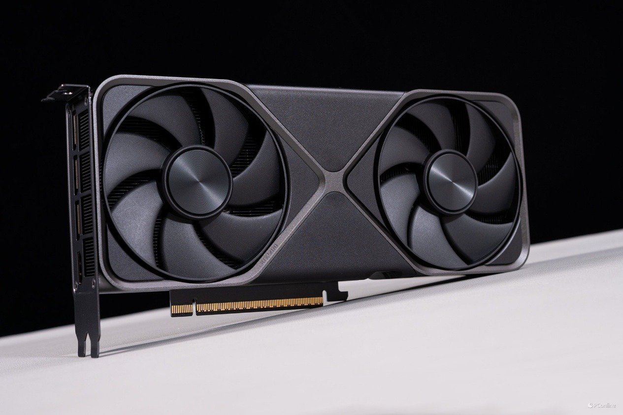 再细看显卡,表面采用黑化处理,由阳极氧化工艺打造,与RTX 40系的比较接近,对比RTX 30系的话,颜色偏灰黑色一些,整体更加沉稳低调。并且正面没有了RTX 40系的鳍片,而是改成了金属遮罩,观感更佳。