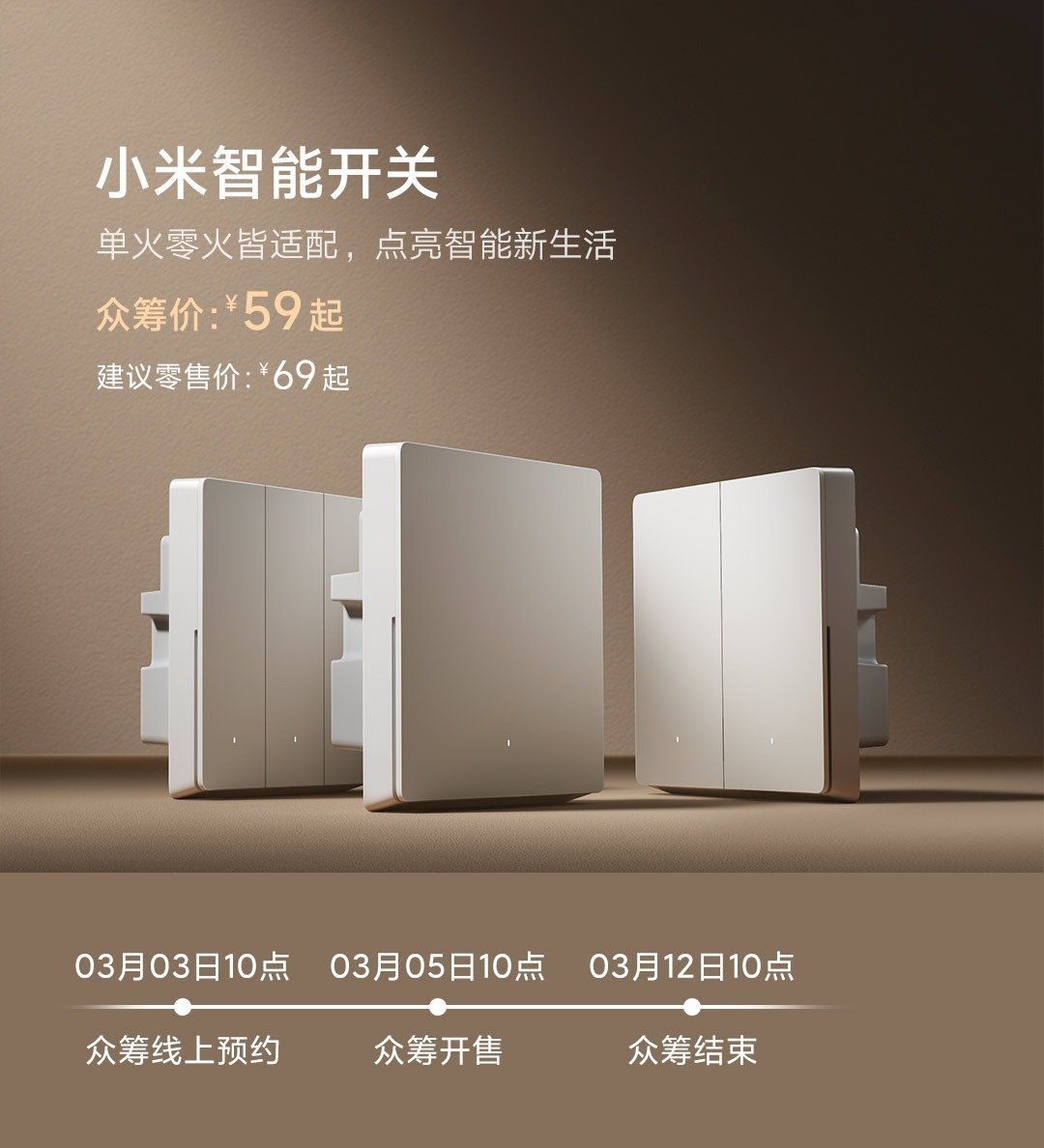 3 月 5 日,小米智能开关正式在小米众筹页面开启众筹,建议零售价为 69 元起,众筹价则是 59 元起。