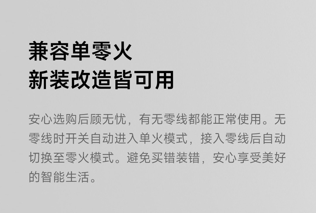 小米智能开关可以兼容单火和零火的不同模式,可以在没有零线的状态下接入使用,会根据零线接入状况自行切换模式。它内部搭载了全新的模组,可以支持小米 IoT Mesh 2.0,有更高的射频效率,且连接更稳定。