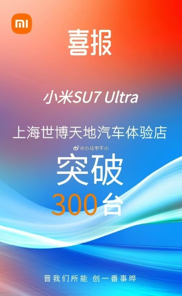 【CNMO科技消息】近日,CNMO注意到,网传信息显示,小米汽车上海世博天地汽车体验店已经卖出了超过300台小米SU7 Ultra。以52.99万元的最低官方指导价格计算,该店这几天关于小米SU7 Ultra的销售额至少达到了1.58亿元。