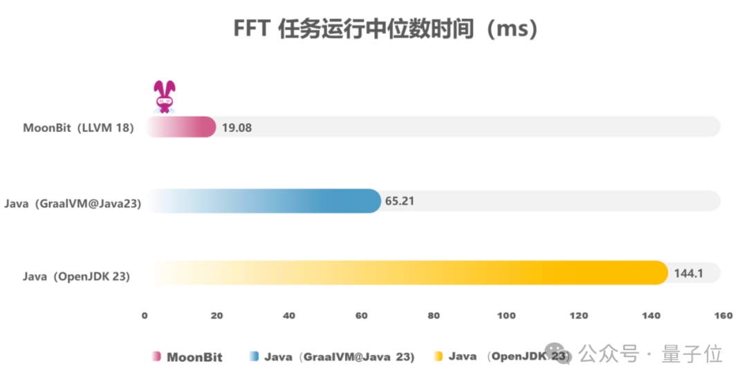 下面是MoonBit与Java实现的FFT算法的性能对比。FFT(快速傅里叶变换)是一个计算序列的离散傅里叶变换的高效算法,在信号处理、压缩等许多领域有重要应用。FFT算法涉及大量数值运算和数组操作,可以很好地体现语言的基础性能: