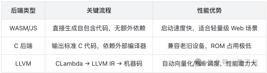 MoonBit同步完善C后端并推出LLVM后端,分别针对嵌入式设备优化与跨平台高性能场景,通过统一工具链实现从硬件层到服务端的全场景覆盖。