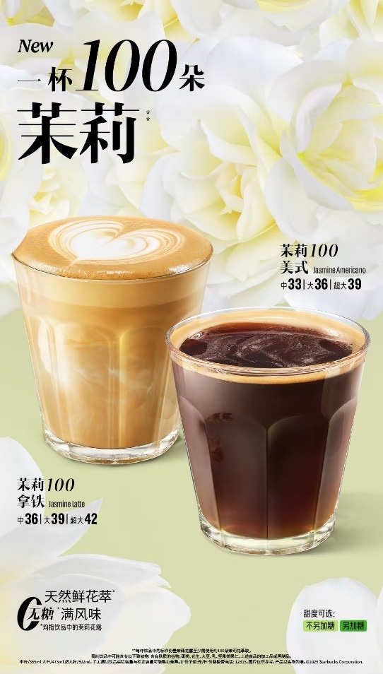 全新系列包括茉莉100拿铁和茉莉100美式两款饮品,清新的花香与鲜嫩的茶香交织,烘托出金烘浓缩的明亮柑橘尾韵,也为咖啡注入了灵动的春意。此外,“不另加糖”的客制化选项,也能够满足顾客多样化的需求。