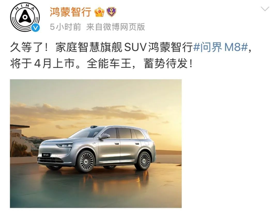 今天,鸿蒙智行正式官宣,新款M9将在本月震撼上市,而问界M8也不用让大家等太久,定在4月登场。