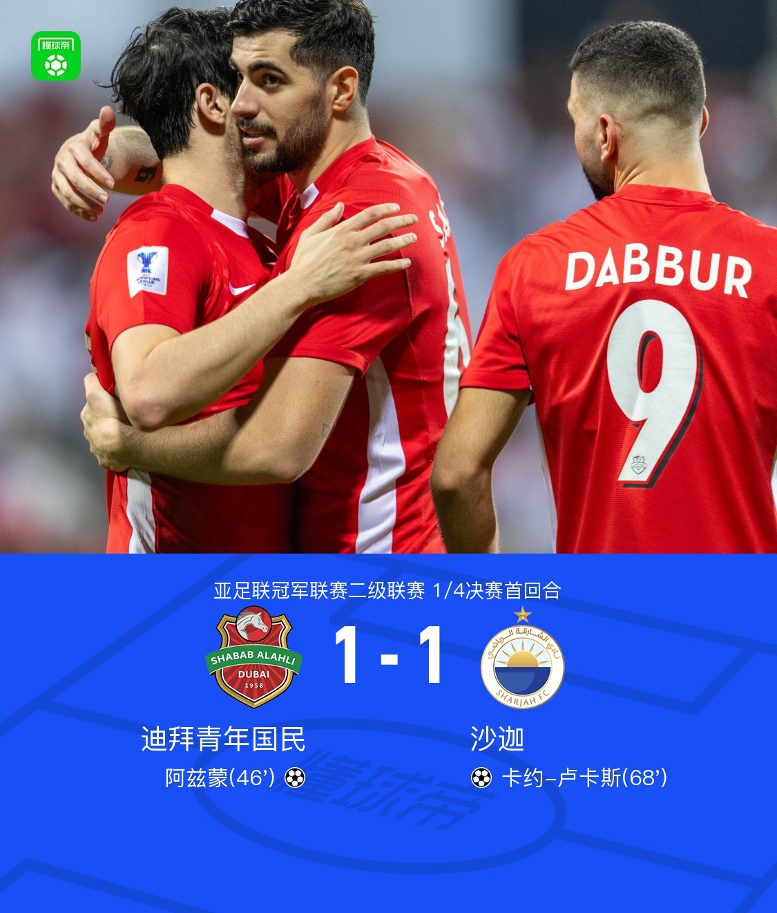 北京时间3月6日,亚足联冠军联赛二级联赛1/4决赛首回合,迪拜青年国民迎战沙迦。比赛中,阿兹蒙为迪拜青年国民打破僵局,随后卡约-卢卡斯为沙迦扳平比分。最终,双方以1-1握手言和。