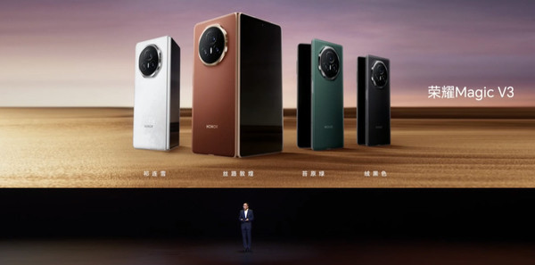 在性能方面,荣耀Magic V3搭载了第三代骁龙8旗舰芯片,采用第二代台积电4nm工艺。影像系统上,该机配备了单反级荣耀鹰眼相机,包含全焦段的三个摄像头:一颗5000万像素广角摄像头(F1.6光圈,支持OIS光学防抖)、一颗4000万像素超广角摄像头,以及一颗5000万像素潜望式长焦摄像头(支持3.5倍光学变焦,最高100倍变焦,支持OIS光学防抖)。此外,内外屏还分别配备了两颗2000万像素前置摄像头,光圈为F2.2。