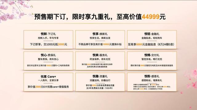 预售期间,下订用户可限时享焕新礼、金融礼、质保礼、服务礼、交付礼等价值44999元的九重豪礼,覆盖现金抵扣、金融政策、整车/三电质保、保养、流量等拥车全流程。其中,价值3999元的智控充电桩,以及30米的增值安装服务,让首次购买电车的用户也全无后顾之忧。到店试驾更有机会抽取价值44999元的悦意锦鲤券,福利与诚意双向拉满。同时,围绕“颜值、续航、舒适、智能、安全”,悦意03将为用户带来五大“悦级”体验,成为城市纯电SUV的理想之选。