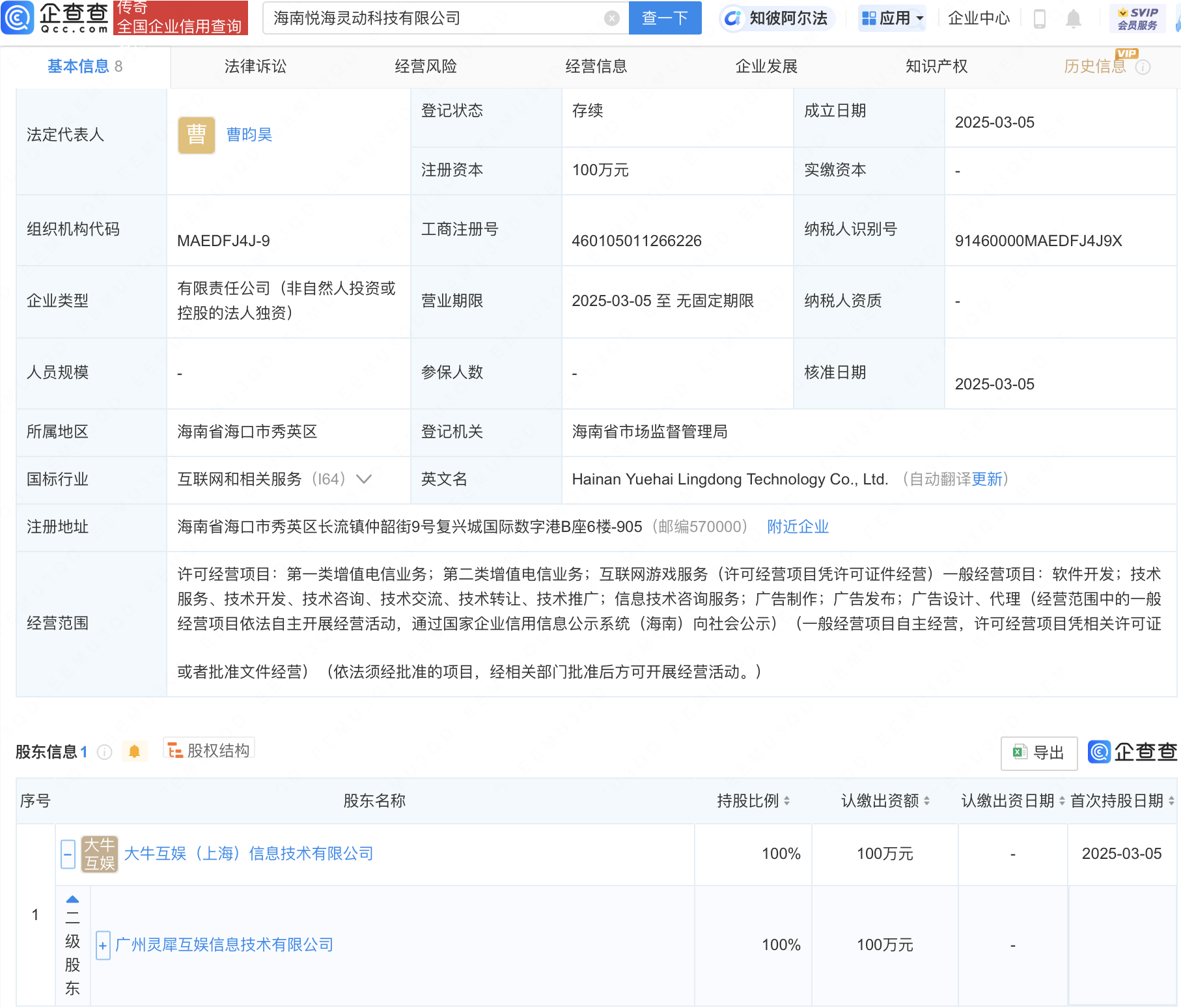 企查查APP显示,近日,海南悦海灵动科技有限公司成立,法定代表人为曹昀昊,注册资本100万人民币,经营范围含第一类增值电信业务、第二类增值电信业务、互联网游戏服务等。企查查股权穿透显示,该公司由大牛互娱(上海)信息技术有限公司全资持股,后者为阿里巴巴旗下广州灵犀互娱信息技术有限公司全资子公司。