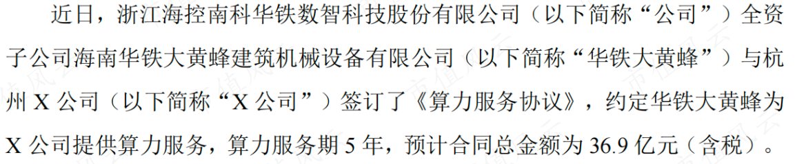 公告具体内容为公司全资子公司——华铁大黄峰与杭州X公司签订了《算力服务协议》,约定华铁大黄蜂为X公司提供算力服务,服务期5年,预计合同总金额含税为36.9亿元。