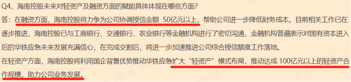 公司称海南控股将力争协调融资授信金额50亿元以上,同时将利用国企背景优势推动公司达成100亿元以上的轻资产合作规模。