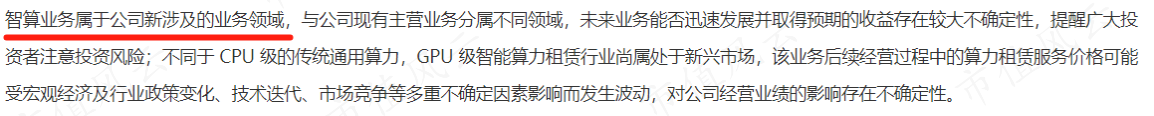 海南华铁最早是在2024年5月份公告拟投资10亿元开展智算业务,通过向客户提供GPU级的高端算力资源租赁及增值技术服务取得收益。
