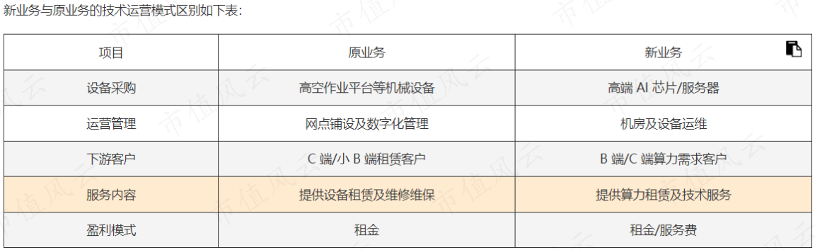简单来说,公司新业务板块运营中“算力设备采购+智算中心建设及管理+算力租赁+技术服务”的业务流程与原有业务“采购+资产管理+租赁+服务”一体化经营模式高度吻合。