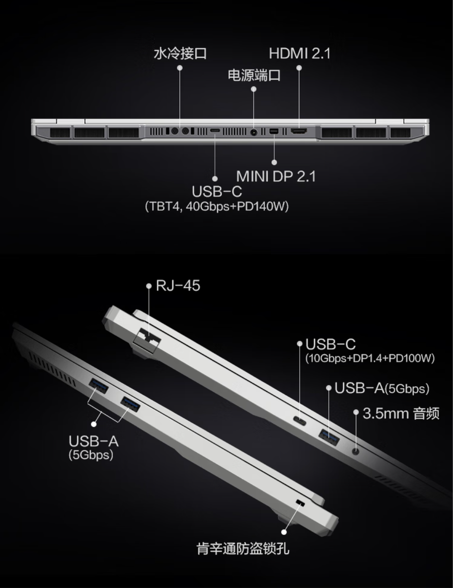 机械革命耀世16 Ultra还提供了水冷接口,支持水冷散热,在水冷散热的加持下,满载情况下也只有40dB,带来更安静的使用体验,如果你需要长时间的满性能输出,那么也可以选择水冷散热来加强散热能力。