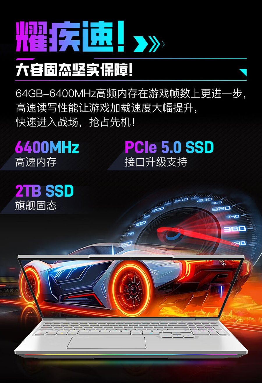 其他配置方面,机械革命耀世16 Ultra配备64GB 6400MHz内存,提供2TB固态硬盘,并且预留了PCIe 5.0扩展位,方便用户后期升级,让你可以将资料以及喜爱的游戏全部存储在电脑当中。
