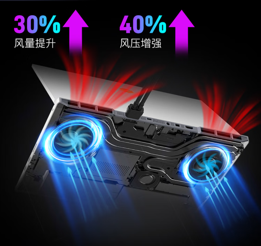 机械革命耀世16 Ultra配备了全新的冰河散热架构,搭载3个冰鲨风扇,并提供翼型环流鳍片,在风量提升30%的同时风压增强40%,配合纳米相变散热硅脂,可以快速散热,确保核心部件的稳定运行。