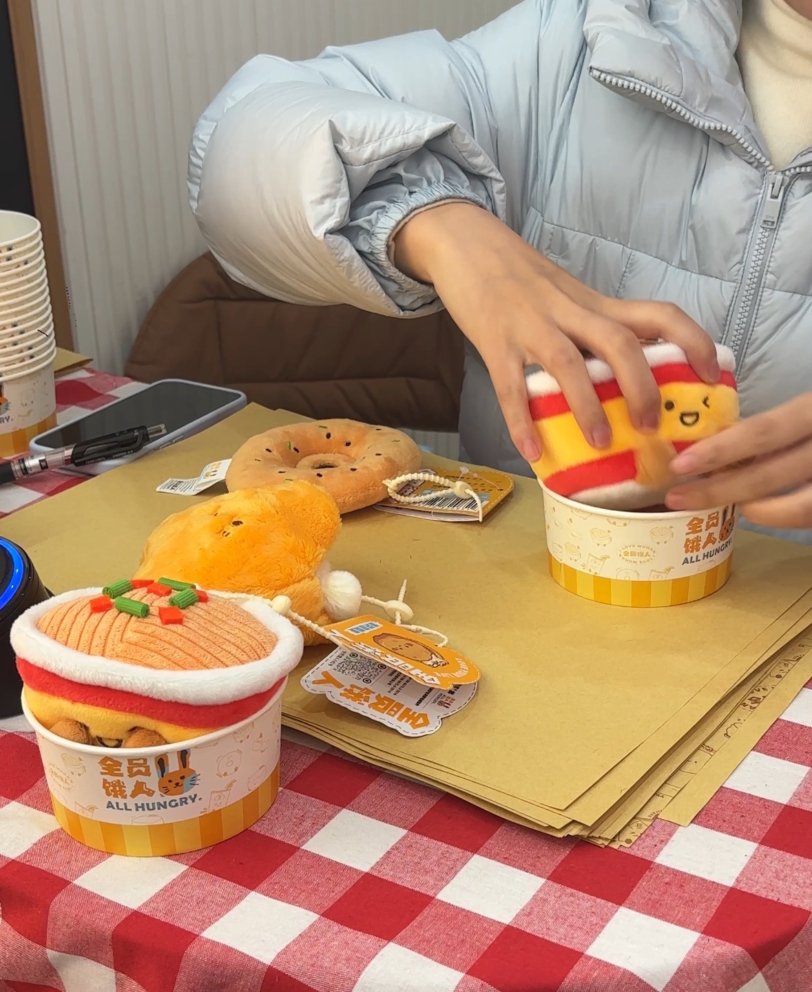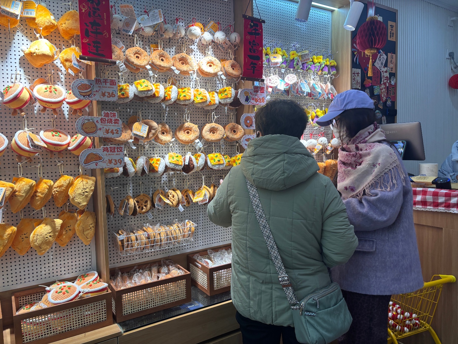记者在该店看到,一位顾客在店里购买了“热干面”“面窝”“油饼包烧麦”多款美食文创产品,店员正用纸碗为其打包,手法类似于知名文创店Jellycat的打包仪式。