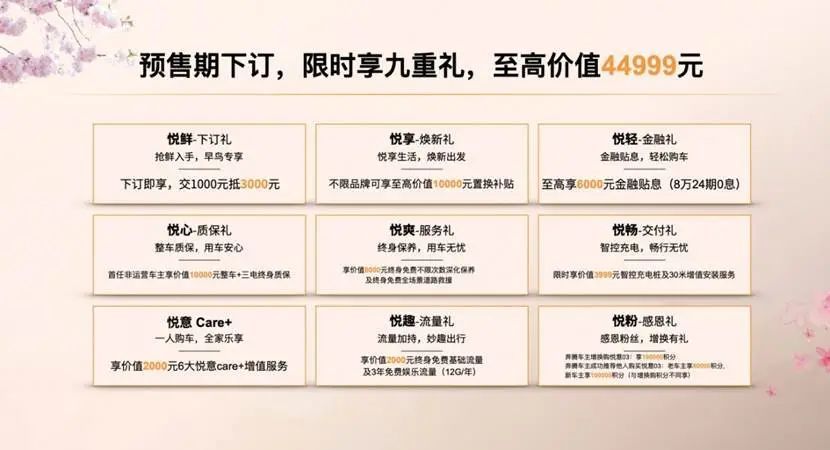 最后给打算买这台车的小伙伴提个醒!在预售期间,下订的用户可限时享价值44999元的九重豪礼,覆盖现金抵扣、金融政策、整车/三电质保、保养、流量等。其中很值的就是,价值3999元的智控充电桩,以及30米的增值安装服务,确实让买电车的朋友在家就能方便充电了。那么3月底,悦意03即将正式上市,而现在新车已经到店了,喜欢的小伙伴们不妨去看看实车吧!