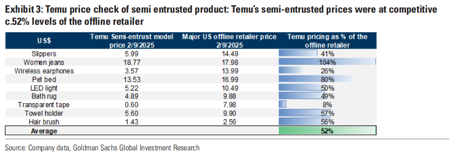 另外,高盛研报则提供了另一个对比视角。其将Temu的主要“假想敌”定为以各类“一元店”为代表的廉价线下零售商。以2月9日的数据为例,在Temu上,即便是半托管产品(平均价格普遍高于全托管商品),其平均价格也只是美国线下零售商的52%。