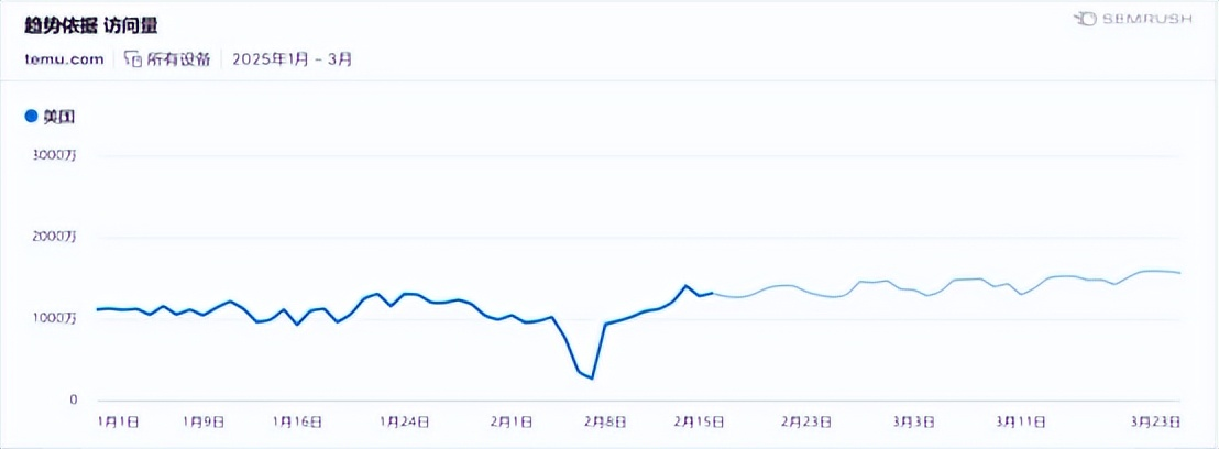 首先,流量方面的波动不容忽视。以Temu为例,据Semrush数据,在2月3日至8日的五天内,其在美国市场的访问量出现了显著的下降趋势:从单日1000万次左右,下跌到了500万次以下,但随后又快速攀升回原位。