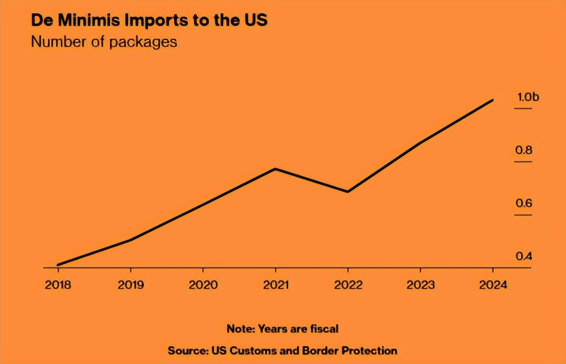 根据CBP的数据,过去10年,进入美国的“小额豁免”货物数量从2015财年的每年约1.39亿件增加到2023财年的每年超过10亿件,增幅超600%。2024财年,这一数字更是上升至超过13.6亿件,其中,中国贡献的份额超过50%。