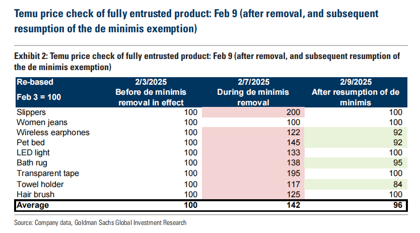 高盛研报的数据显示,从2月3日开始,四天之内,Temu全托管商品的平均涨价幅度高达42%,且全托管与半托管商品的价格首次出现“倒挂现象”。不过在2月7日特朗普宣布恢复中国小额包裹的关税豁免之后,全托管产品价格又迅速回落至原价。