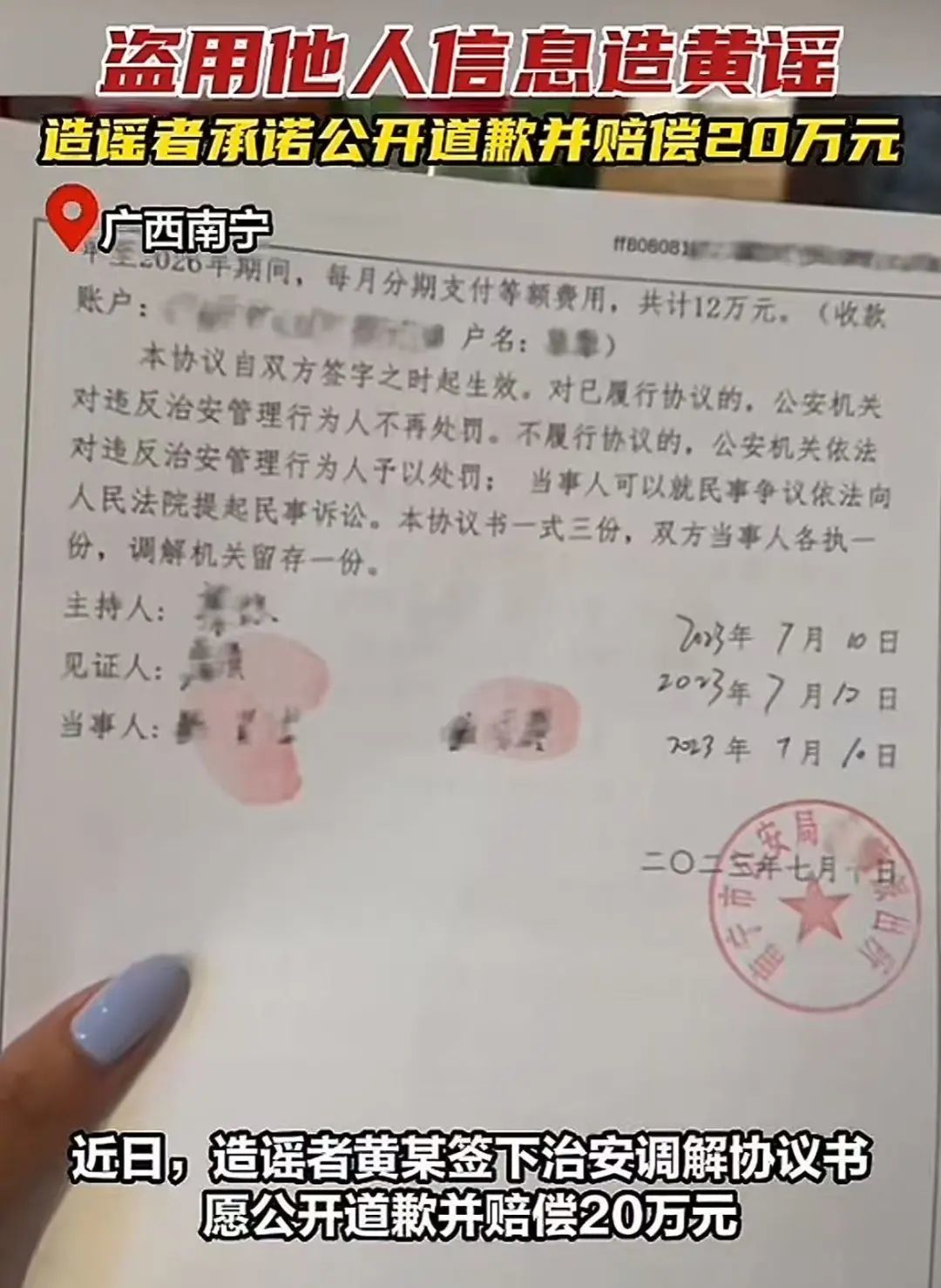 她发现后立马报警,最终造谣者黄某必须公开道歉,并赔偿20万。