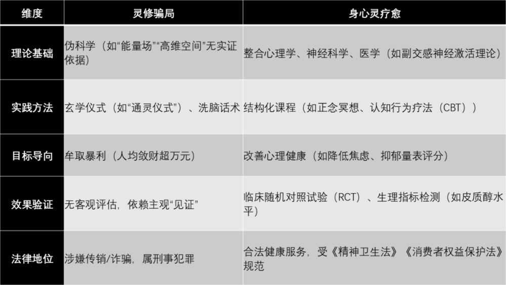 为了方便从不同维度区分的“灵修骗局”和“身心灵疗愈”,精练GymSquare做了一个差异化对比,形成以上表格。