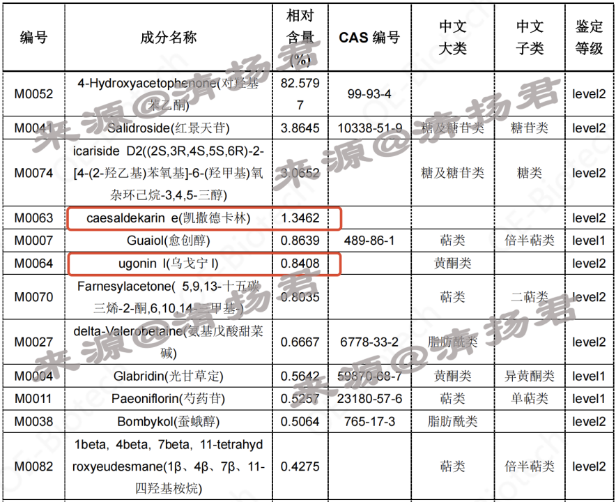 清扬君发现,爆料人提供的检测报告与相宜本草红景天焕白精华液全成分标识相对照,在其列出的94个活性成分中,排名第四的“caesaldekarin e(凯撒德卡林)”相对含量占比1.3462%,排名第六的“ugonin I(乌戈宁I)”相对含量占比0.8408%。然而,这两种成分不仅未在药监局官网完成注册,亦未被收录进《已使用化妆品原料目录》之中。