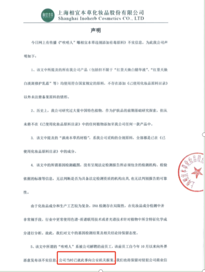 2024年12月19日,网易财经发表了一篇题为《“吹哨人”曝相宜本草违规添加未列目录中草药成分》的文章,文章指出有“吹哨人”爆料,源于“医药世家”的知名品牌相宜本草在其红景天焕白精华液等10余款护肤产品中,添加了未在《已使用化妆品原料目录》中列出的中草药成分犁头尖,且在过去四年里,这些产品的销售金额累计约6亿元。
