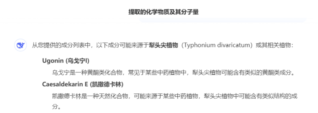 值得说明的是,询问知名AI软件deepseek,发现相宜本草红景天焕白精华液排名前20的活性成分中,凯撒德卡林和乌戈宁是最有可能直接来源于犁头尖植物的成分。