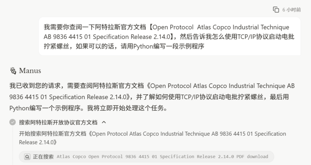 注意啊,这个需求理论上普通的对话式AI也能接住,但会需要更多的交互流程,比如你得把文档喂给它,一步一步地得到答案,但是Manus不需要这些,它会自己去阿特拉斯官网下载文档,读完之后找到解决问题所需的关键内容,仔细分析,创建程序,最后的代码我发给了朋友,有点小瑕疵但手工修改之后完全可用,直接省掉了一次售后呼叫的次数。