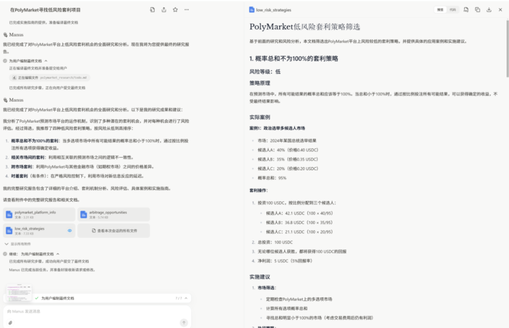 再如让Manus去研究PolyMarket的套利可能,虽然我确实有那么一丝期待,想得到一个稳赚不赔的投资指南——别笑——Manus倒是兢兢业业地做足了功课,列出了四个套利机会,让我只要在PolyMarket看到符合条件的项目出现,就能无脑按规则下注。