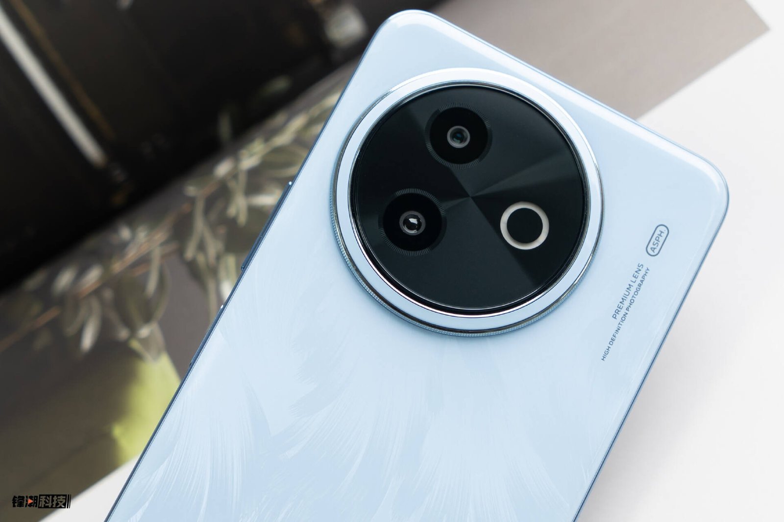 虽然正面表现一般,但 vivo Y300i 的背面设计就加分不少了。它采用了颇具细节的背面设计,比如在镜组的部分采用了全新星钻圈环镜组,装饰环的部分看起来还有着十足的陶瓷釉感,结合双层钻石纹理,光影效果也很精致。
