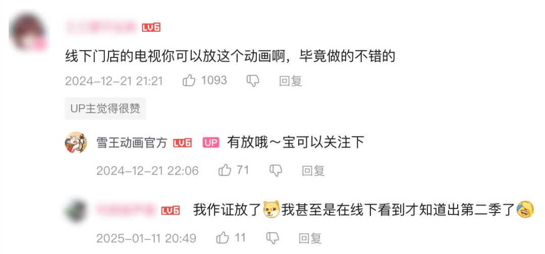 在2023年和2024年底,蜜雪冰城分别推出《雪王驾到》和《雪王之奇幻沙洲》两部动画片,全片没有半句话宣传蜜雪冰城,只有雪王升级打怪,一心一意夺回权杖的冒险故事。第二季播出后,有网友建议官方,“线下门店的电视你可以放这个动画啊,毕竟做的不错的”。